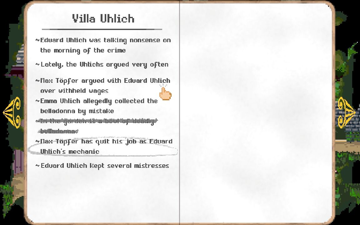 • Interactive Deduction: Use your notebook to track leads and your deduction board to connect clues and reach conclusions.