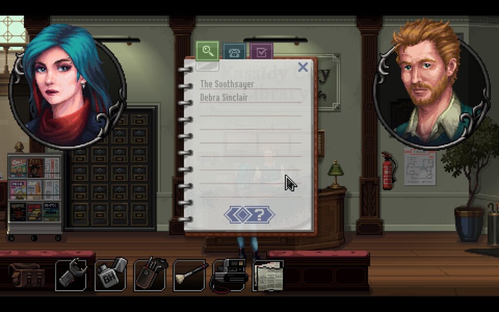 The city is currently in an uproar over a murderer known as the Soothsayer, whose murders are marked by shards of obsidian scrying mirrors found next to the victims. Although Kathy has misgivings about investigating a serial killer on her own, the promise of a reward for anyone who can catch the culprit convinces her to take on the case. The game is split into days and evenings, and time passes automatically once you’ve completed all of your goals for the current section. In addition to listing key details you’re searching for information about and phone numbers, Kathy’s notebook also keeps track of your current objectives so you can easily check what you still need to work toward.