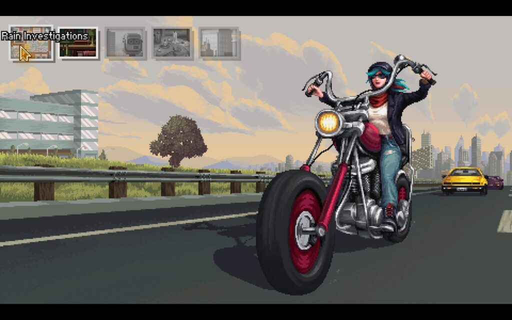 Gameplay uses a point-and-click format, and you can press the spacebar to see all items that can be interacted with in an area. As I mentioned in my preview, Kathy has a somewhat slow walking speed, but each area is small enough that it avoids being tedious. As you progress your investigation, you’ll unlock more places to investigate, although there are times when some are inaccessible. All of these locations can be accessed from a travel screen that uses a beautiful background of Kathy riding her motorcycle.
