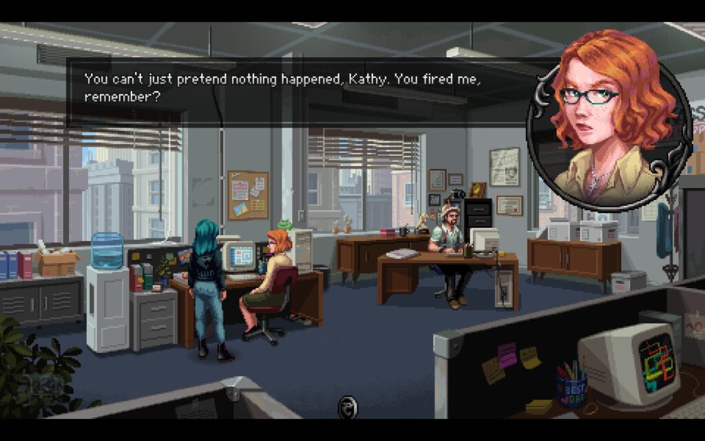 Three years later, Kathy is now a private investigator. There are some details of the years in between that are only implied, as she has connections with characters who weren’t in the first game, but it’s easy enough to work out what’s going on. Things aren’t going too well for her, as she’s struggling to make ends meet while working on her own. In my preview last year, I mentioned that Kathy seemed less sarcastic and grating this time, but that turned out not to be true. She’s still a fairly abrasive character. However, that’s clearly an intentional writing choice, as it’s part of her character arc that she’s managed to alienate herself from people who care about her.