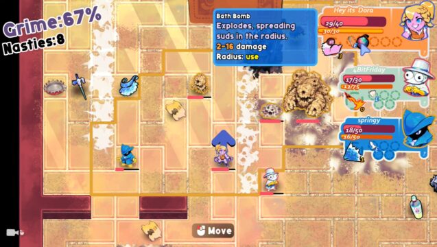Designed with pick-up-and-play in mind, Scrubbin’ Trubble lets you jump into a solo run or team up with friends via local or online co-op. Its approachable learning curve makes it accessible even to those new to roguelikes, while its layered combat and synergy-focused class design give it plenty of strategic depth.