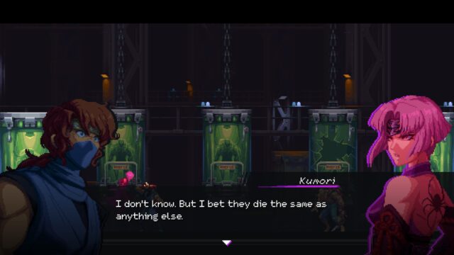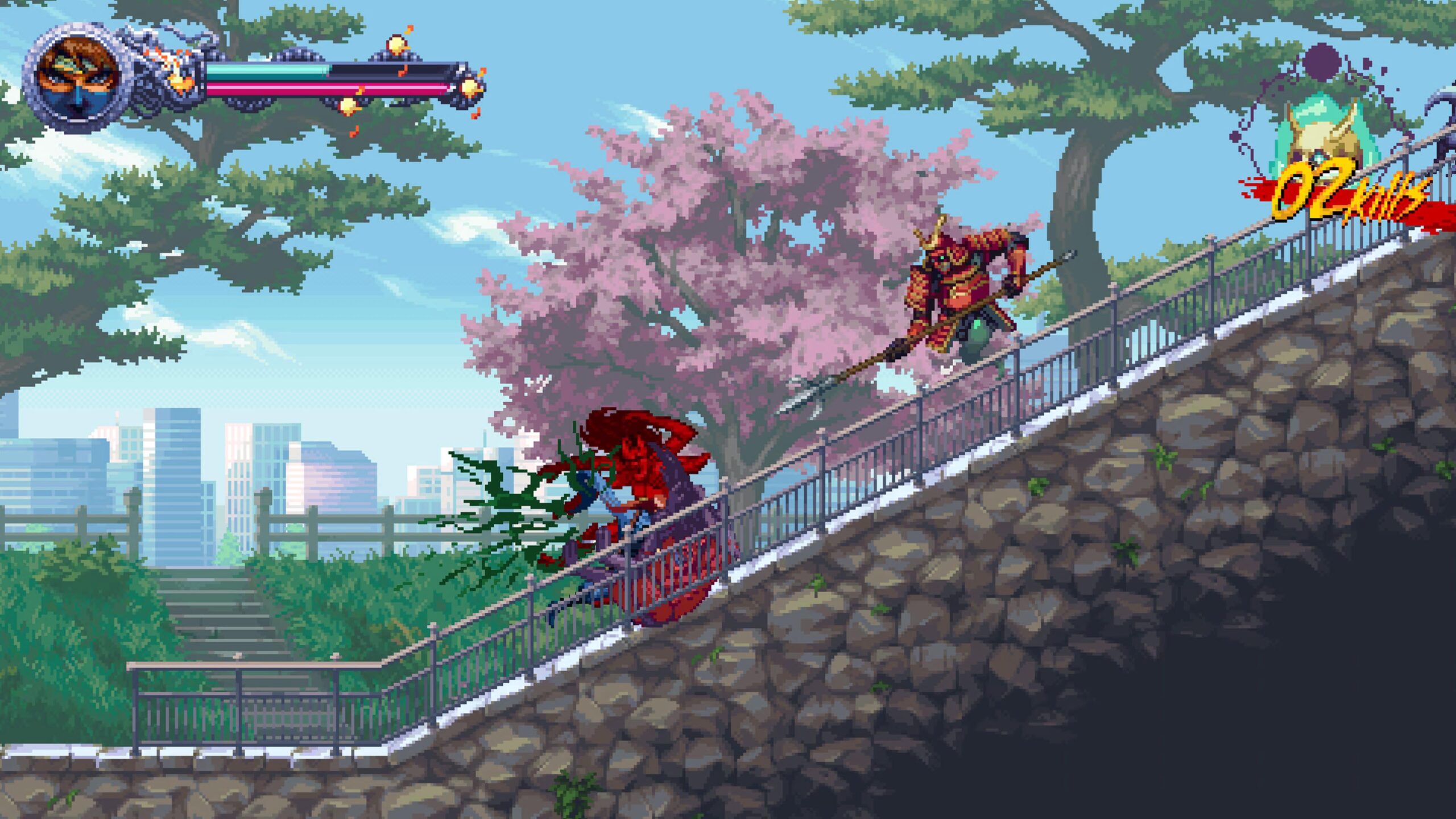 Melee attacks are primarily performed by Kenji, while ranged kunai moves are Kumori’s fare. This separation works for both the story and the gameplay, as you occasionally have to take part in Kumori-exclusive platforming sections, whether to progress or to grab some well-hidden collectibles. These almost feel like mini challenge levels tucked within each stage, making the pacing feel even more varied and refreshing.