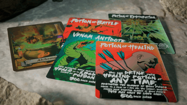But the real eye-catcher is the box’s cards. Each one is a full-art foil that feels like it should be a game of its own. Rewarding players with cards really helps sell the overall story, too, because of how different they look compared to the original card set in the base game. Something as simple as a health potion now feels like a premium item that they should be proud of because of the amazing art on the card.