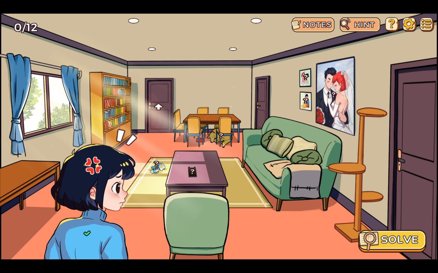 The game is split into cases, each of which presents a different situation from Mary’s year. You can click on objects in the environment to gather clues, with the option to mark or not mark interactive spots. Most clues are words added to your list, while others are visual. For example, you might click on a character to see their phone, from which you can get the names of people who recently sent them messages and keywords about what they discussed. Some clue locations won’t contribute to your list but are there for your reference, as you need to piece together the full situation.