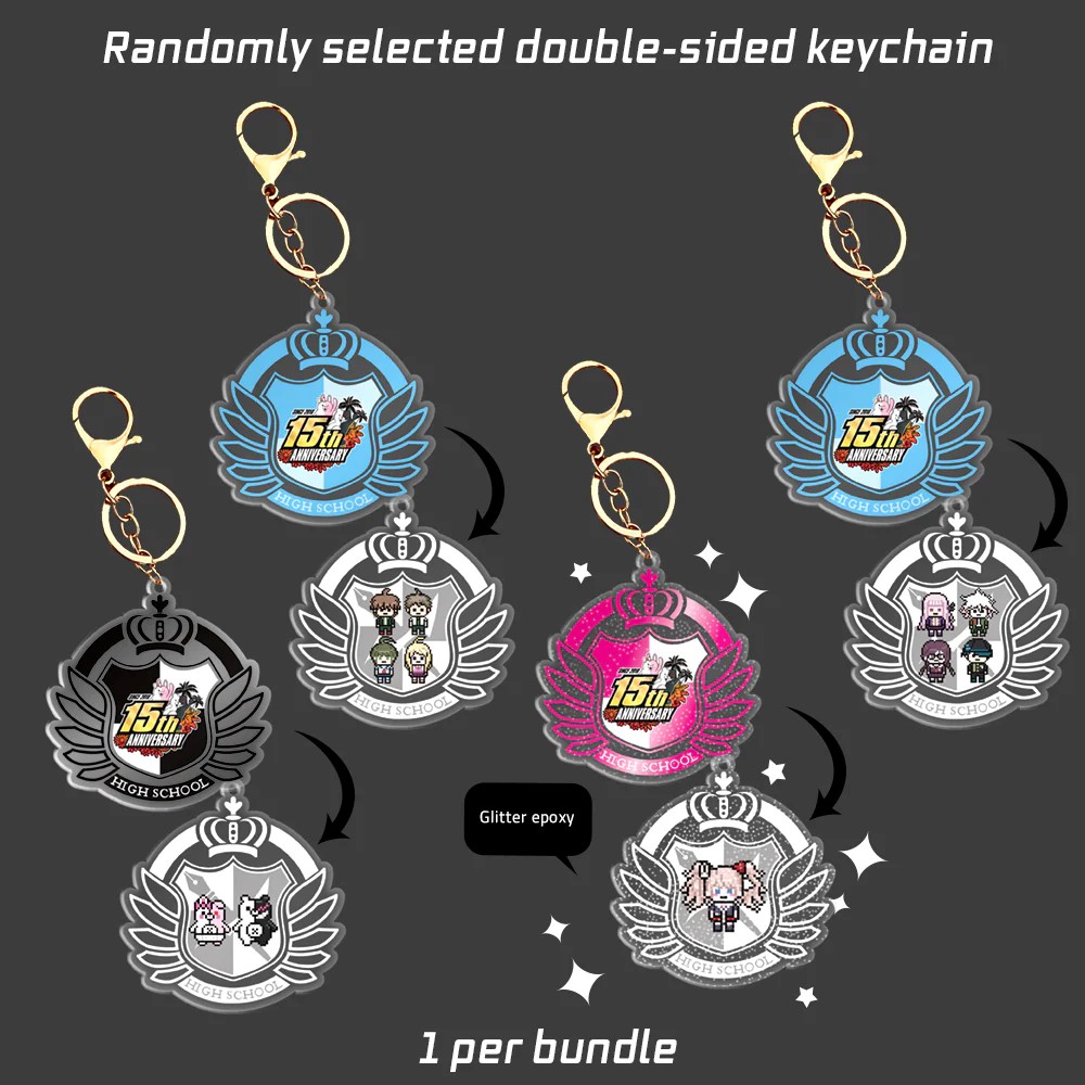 Each bundle contains one randomly selected 3-inch acrylic keychain from four possible designs, featuring fan-favorite characters from across the series. The available designs include groupings of main protagonists, rival characters, the mascots Monokuma and Monomi, or a special, shiny Junko Enoshima variant with a glitter epoxy finish.