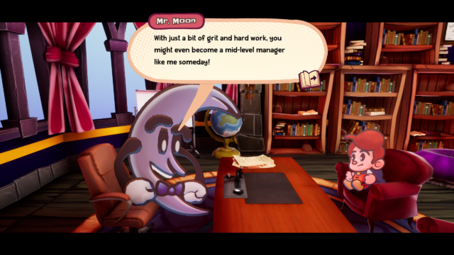 Daniel Whitworth’s soundtrack is excellent, with his jazzy big-band score somehow fitting all the different storybooks you end up in, and also matching the almost-sinister, frantic corporate offices you spend so much time in. Whether I was sailing the pirate infested high seas on a how-did-this-get-approved-by-HR company vacation/treasure hunt, crash landing on an icy alien planet, or saving naive wolves from porcine land developers, Whitworth’s music felt appropriate and engaging.