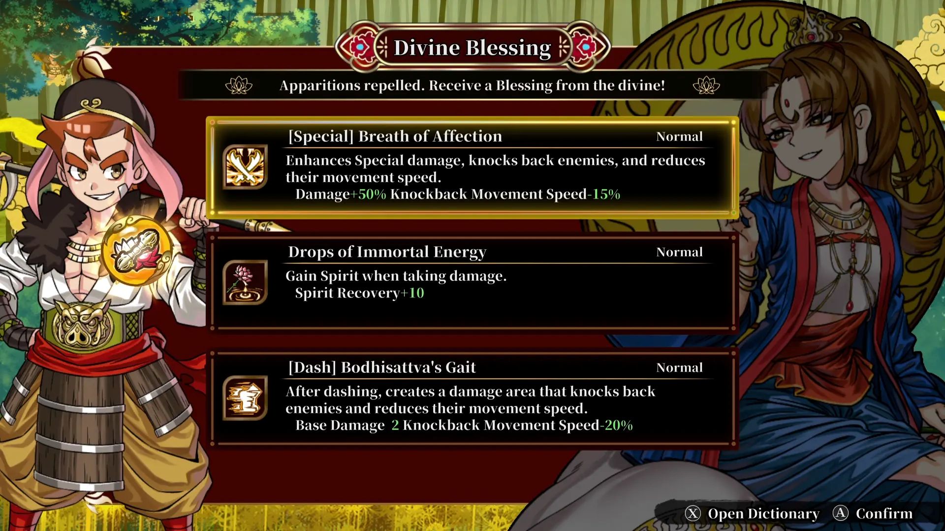 The game uses a roguelike format where each run feeds into progression. As you move through stages, gods appear at random and grant “Secret Skills” that boost your stats and abilities.